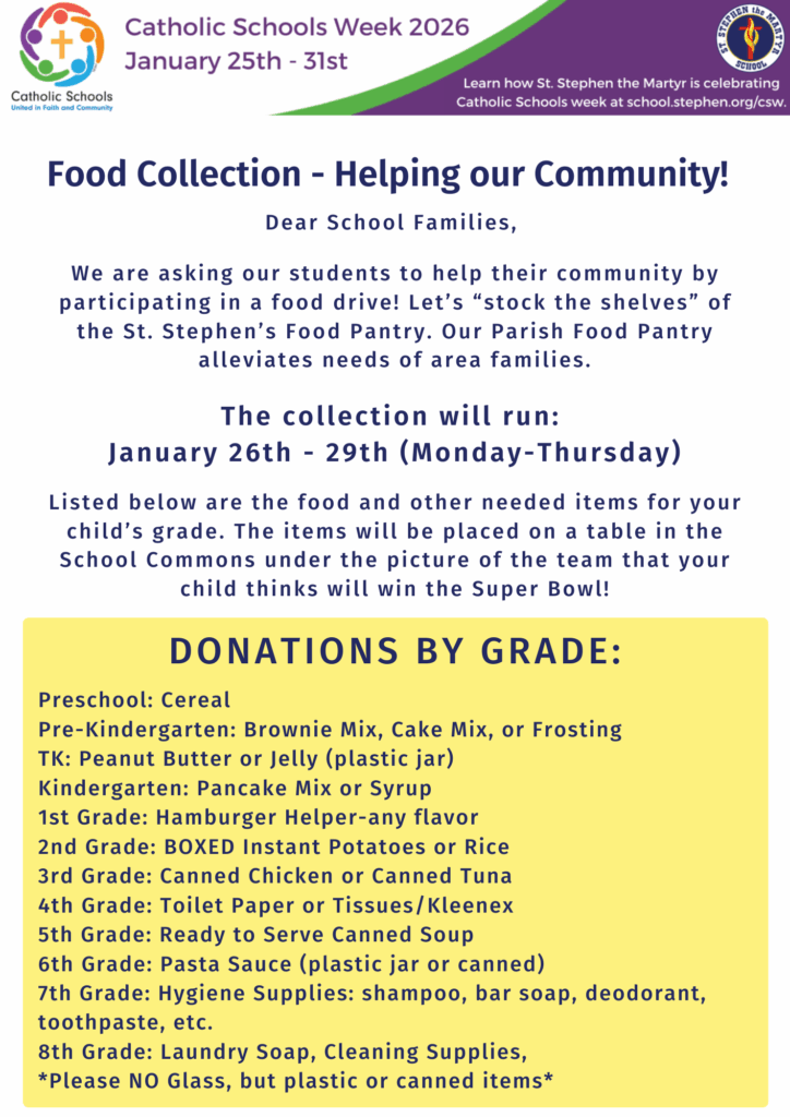 Each day of the school week will open with a special morning prayer, centered around our daily themes. In addition to the activities listed below, there will also be Cosmic Bowling in PE class, Surprise Freeze & Dance and school-wide Food Drive benefitting our St. Stephen the Martyr Food Pantry! We are excited to celebrate Catholic Schools with our students!