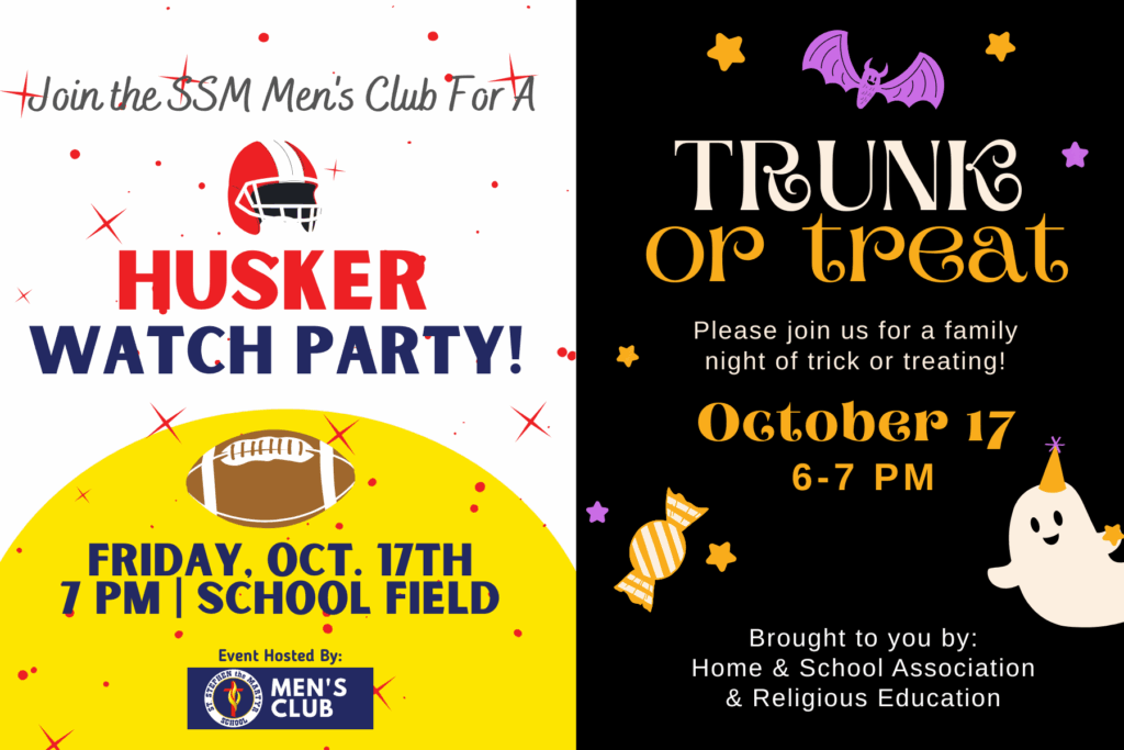 TRUNK-OR-TREAT Join us Friday, October 17th from 6 – 7 PM in the south parking lot for a night of Halloween fun! *Hosted by SSM Home & School Parish Outreach and Religious Education* DJ and Trick-or-Treating at 6-7 PM. Enjoy Dinner from The Cheese Life Food Truck from 6-8 PM PM! See menu here. Please […]